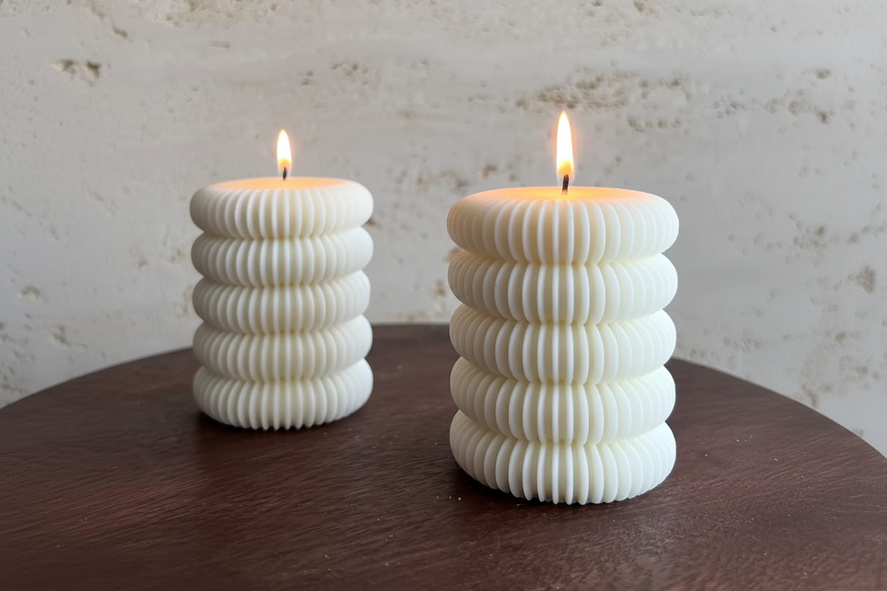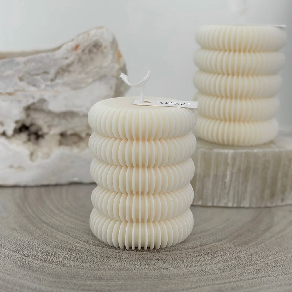 Una vela escultural hecha a mano con textura acanalada en capas y un aroma delicado. Su diseño moderno queda perfecto en estantes, mesas y tocadores, incluso sin encender. Hecha con cera de alta calidad para una combustión limpia, aporta elegancia y calidez a cualquier habitación. Perfecta para espacios minimalistas y regalos especiales. 6,35 cm de profundidad x 7,62 cm de alto.