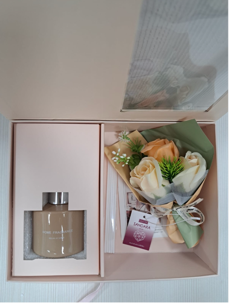 Una elegante y cuidada caja de regalo que incluye un difusor de aroma premium y un delicado ramo de flores de jabón. Diseñado para crear una experiencia relajante y lujosa, este set es perfecto para regalos con significado, momentos de autocuidado o para añadir un toque refinado a cualquier espacio.