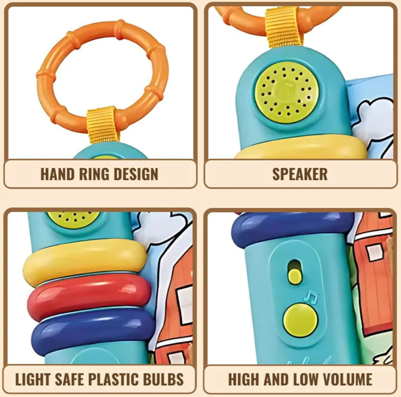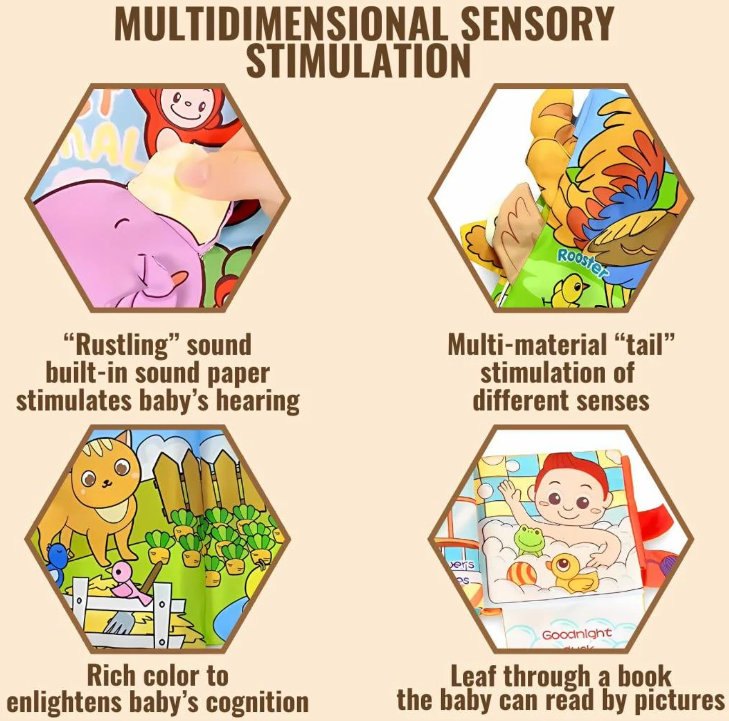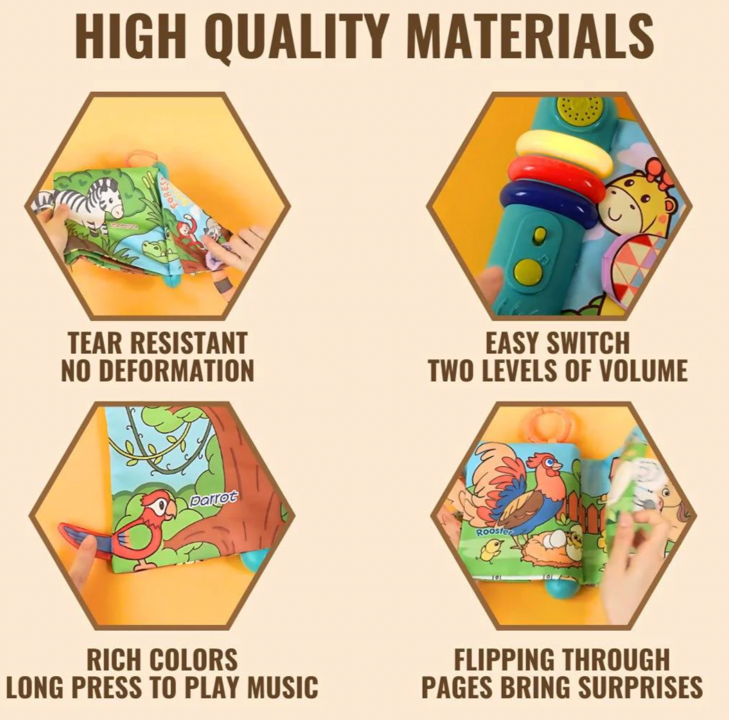 Libro de tela interactivo para bebés con animales del océano, diseñado para estimular el aprendizaje temprano y el desarrollo sensorial. Incluye páginas texturizadas, colores brillantes y botones con sonido para que los bebés se diviertan a través del tacto, la vista y el oído. Ligero y fácil de sostener, perfecto para jugar boca abajo, en el cochecito o en momentos tranquilos en casa.