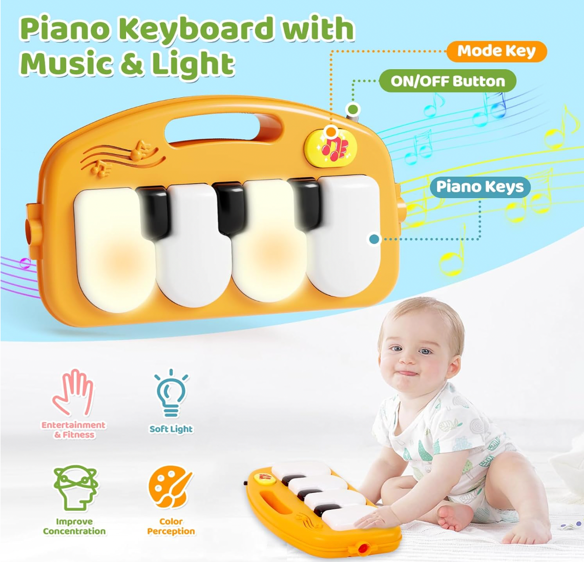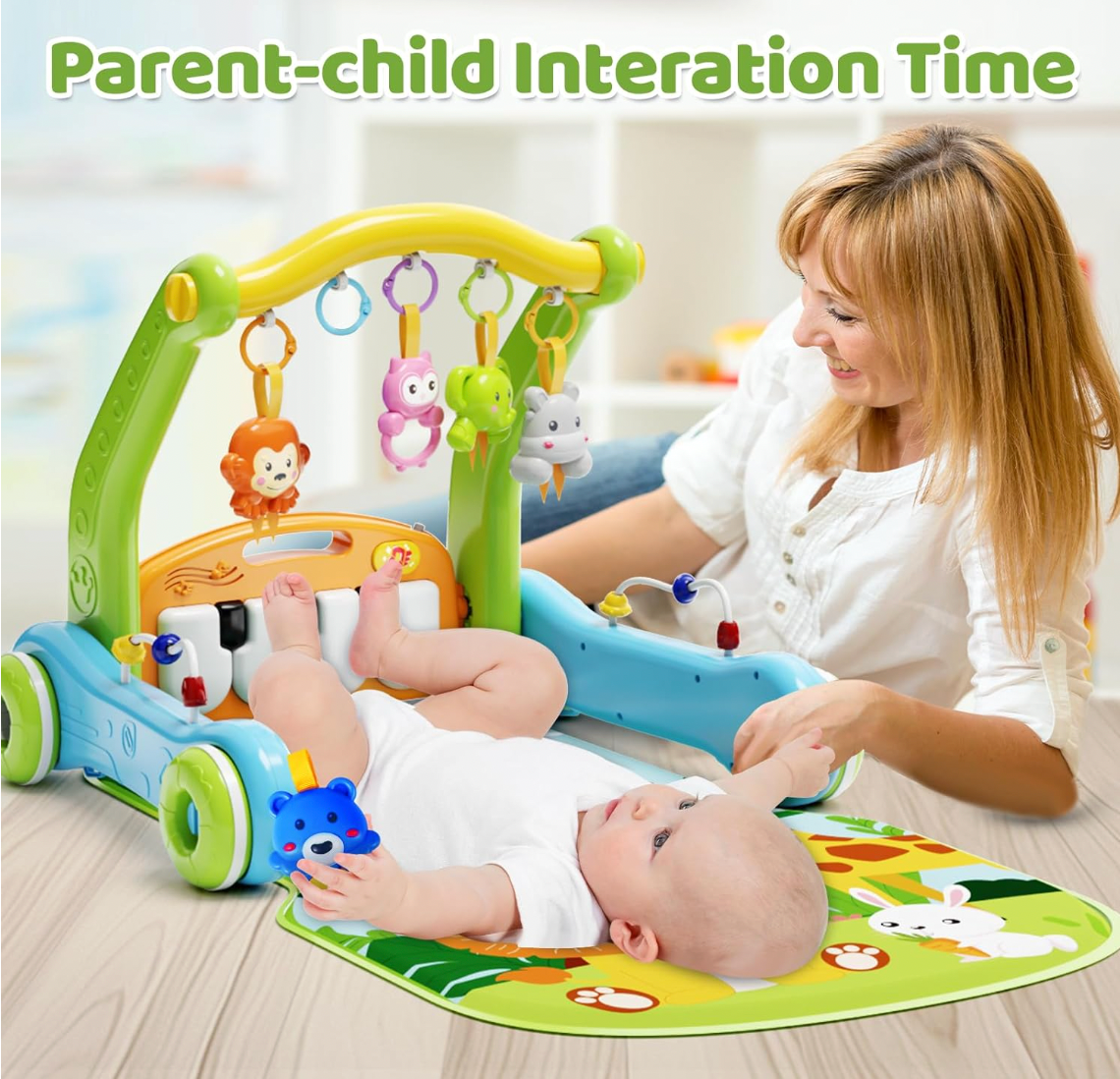 Incluye un piano musical con luces , juguetes sensoriales colgantes y un espejo seguro para bebés que fomenta el desarrollo temprano. El andador tiene un diseño triangular estable y un manillar ajustable en altura para que los primeros pasos sean seguros.