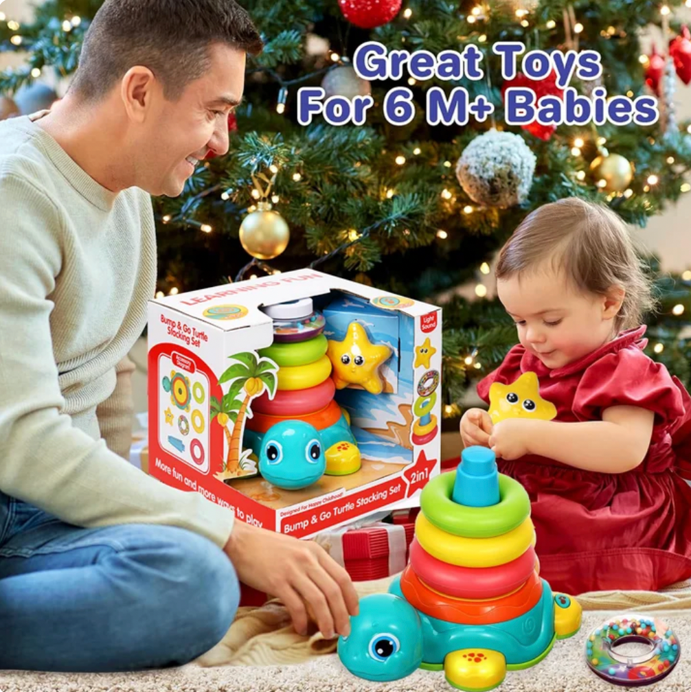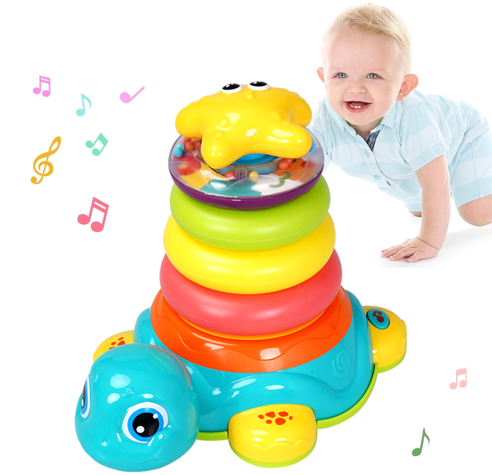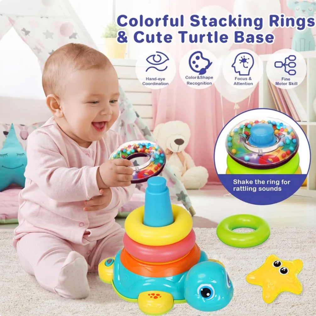 Este colorido juguete musical de tortuga apilable está diseñado para atraer y entretener a los bebés de 6 meses en adelante . 🐢✨
