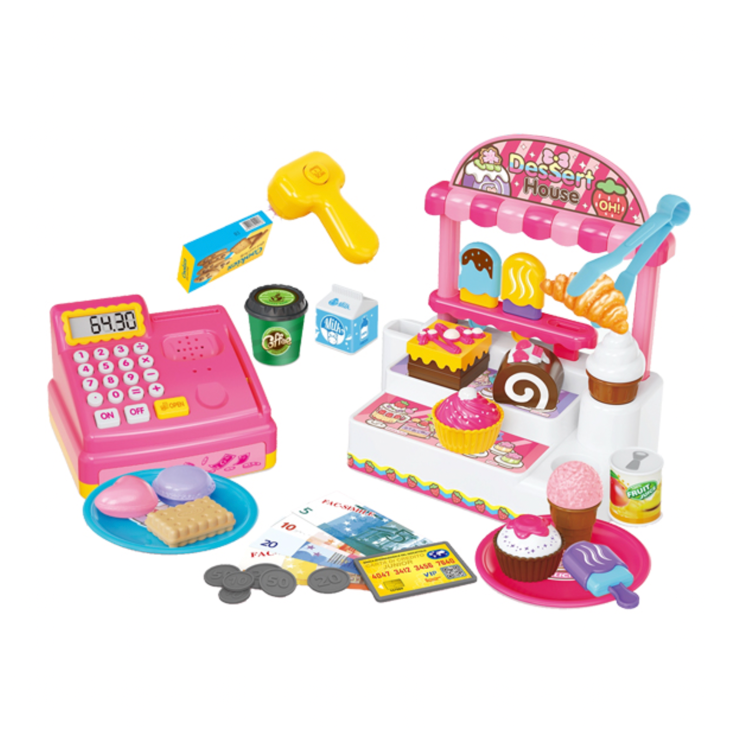 Este divertido juego incluye una caja registradora de juguete con calculadora, escáner y micrófono , además de un mostrador de postres con pasteles y helados para un juego de roles realista.