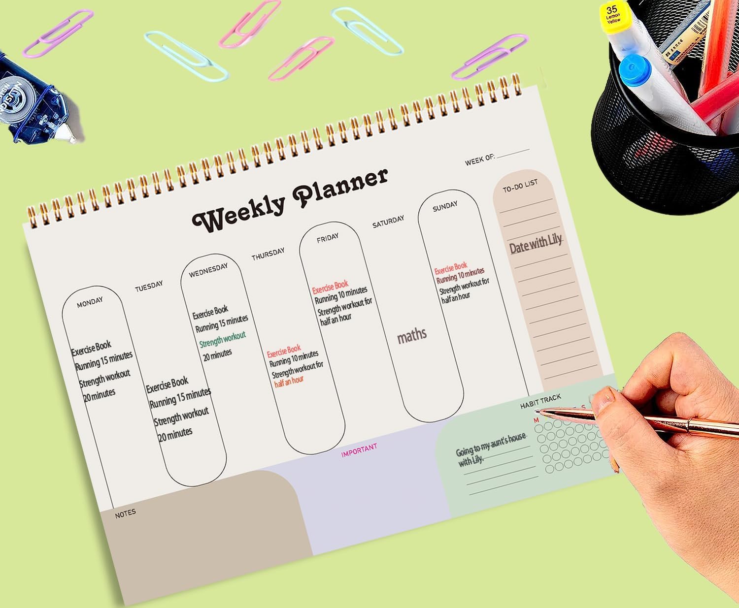 Este bloc de escritorio con planificador semanal está diseñado para ayudarte a planificar tus días, hacer un seguimiento de tus hábitos y mantener todo lo importante en un hermoso lugar.