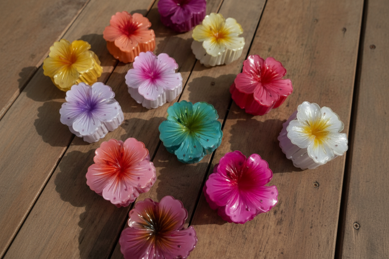 Cada pieza tiene una hermosa forma que recuerda a una flor floreciente y viene en vibrantes colores ombré que iluminan cualquier peinado.