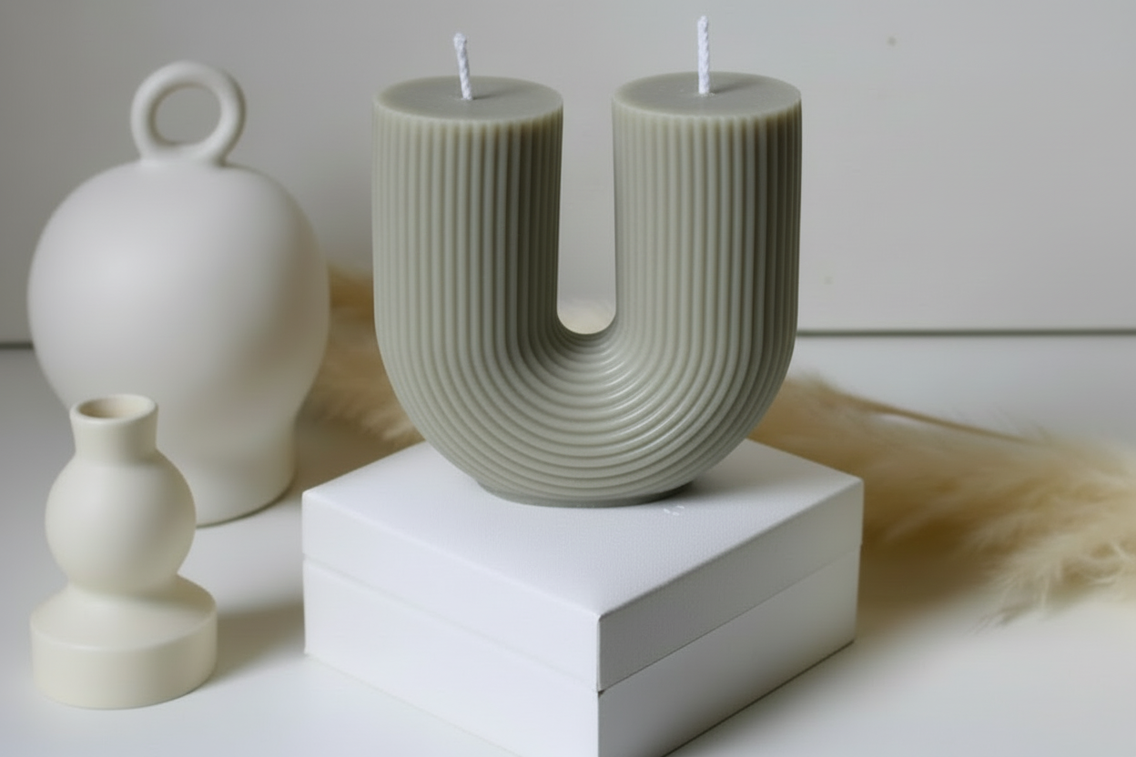 This U-shaped dual-flame candle combines modern design with function. Its ribbed texture and curved silhouette make it an eye-catching accent for any room. Made with premium wax and delicate aroma, it burns cleanly and looks stunning whether lit or displayed. Measures 4inD D x 4.5 in H