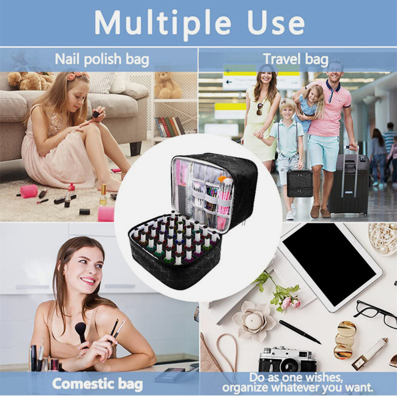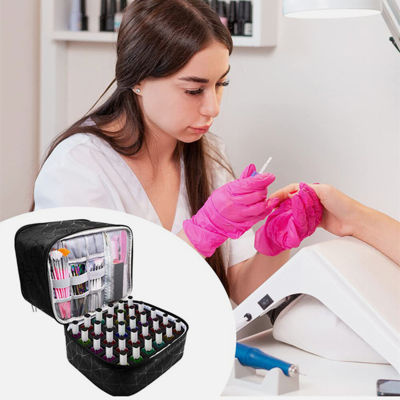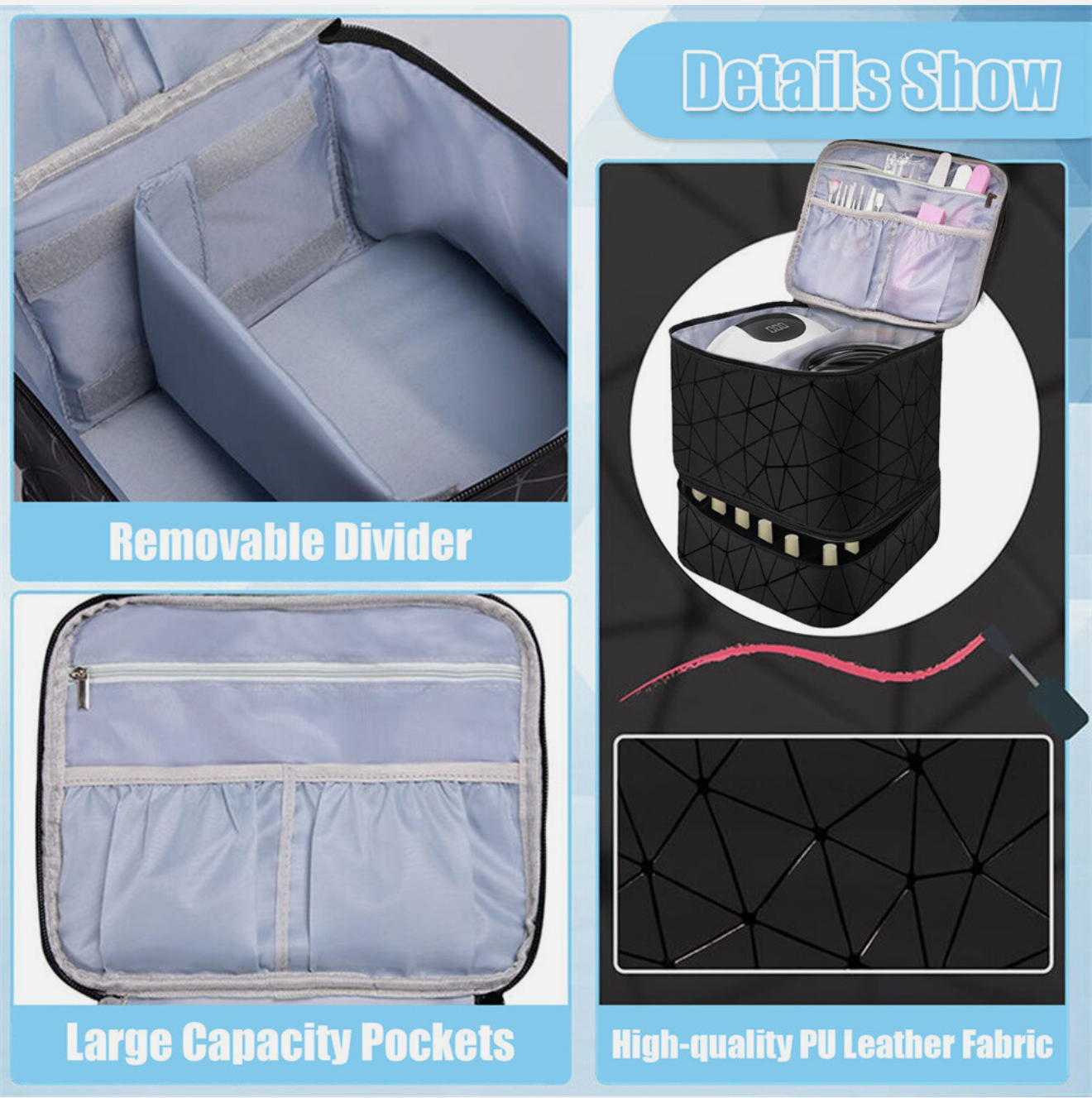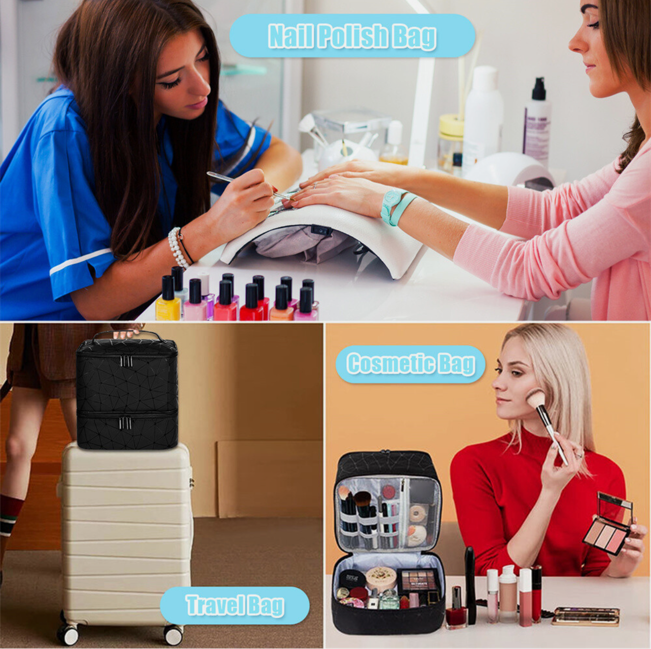 Designed with a double-layer interior, this stylish case is perfect for storing and carrying your nail polishes, nail tools, and beauty essentials all in one place.