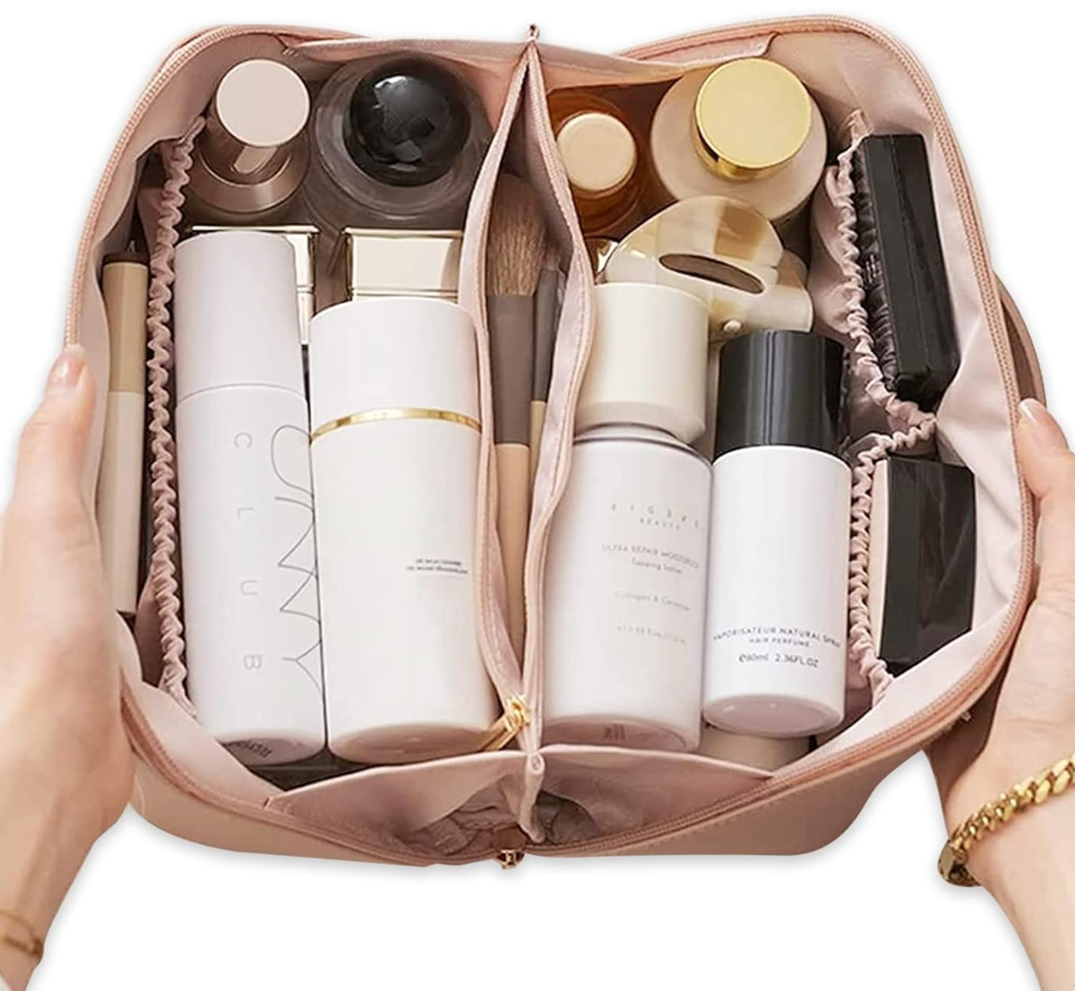 This large-capacity cosmetic bag features a sleek PU leather exterior with a structured shape that stands beautifully on any surface. Its thoughtfully designed interior includes dividers to keep makeup, skincare, and toiletries neatly arranged and easily accessible. The sturdy flat bottom allows it to rest comfortably on countertops, while the top handle makes it perfect for travel or everyday use.